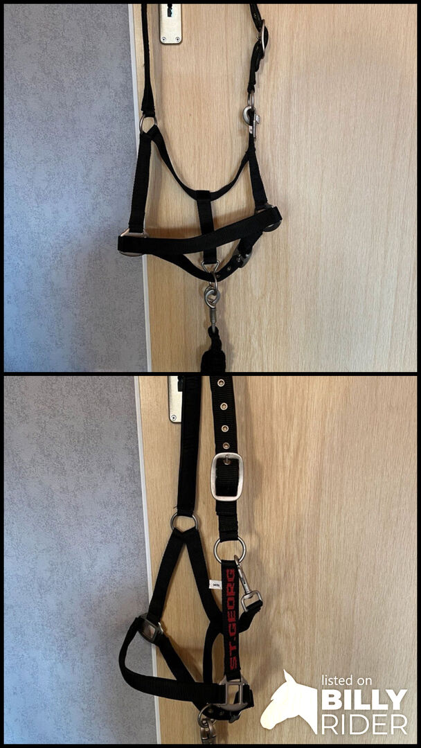 Halster St. George zwart WB met touw - Ik verkoop een halster van St. Georg dat één keer gebruikt is. Het is zwart en inclusief touw met paniekhaak. De halsterset is dus zo goed als nieuw. Het halster wordt uiteraard schoon verkocht. Het halster is een blikvanger door de rode letters.