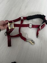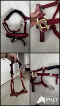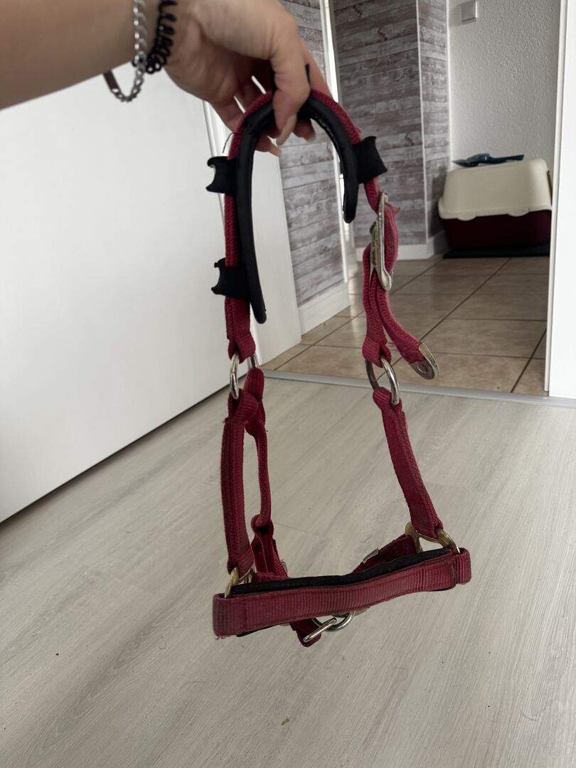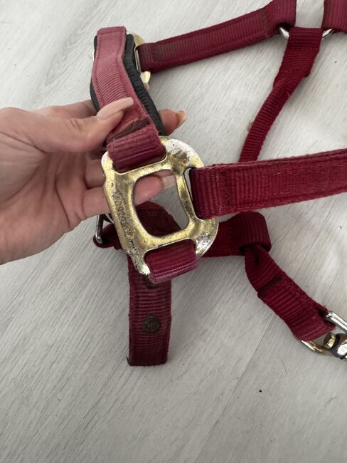 Halstermaat pony - Halster in maat pony Met nekpad. Rood/goud, waarbij het goud op de gespen loslaat, maar geen invloed heeft op het gebruik. Verder licht vervaagd. Particuliere verkoop dus geen garantie of retournering. Verzending mogelijk tegen betaling.