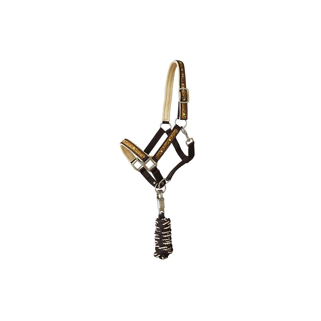 Halsterset "Starlet" brons maat Full - 2-voudig verstelbaar via speldgespen, zacht gevoerde neus en nek, zilver/gesatineerd beslag, ster applicatie Inclusief loodlijn met paniekhaak Maat; Full Colour: brons