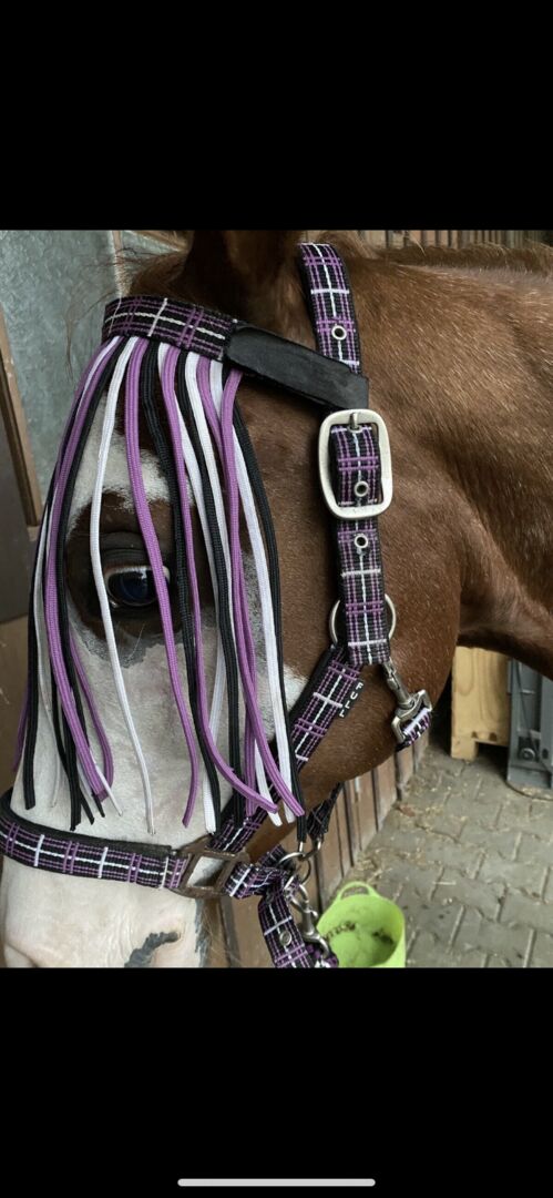 Halter Full in paars/zwart - Verkoop hier een mooi halster met bijpassend vliegenlint en touwmaat is Full.
