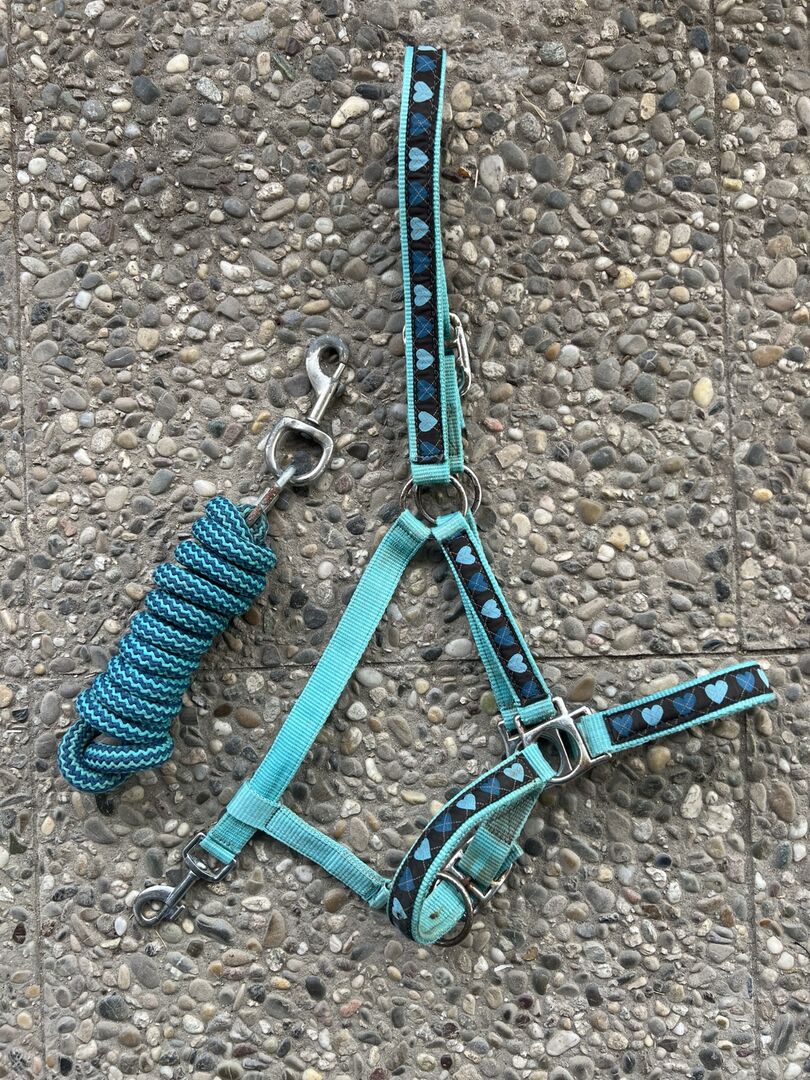 Halter hart turquoise/kolf - Ik verkoop een turquoise gekleurd halster met hart details in maat Cob. Het bijpassende touw is ook inbegrepen. Het is een gebruikt halster, maar in goede staat.