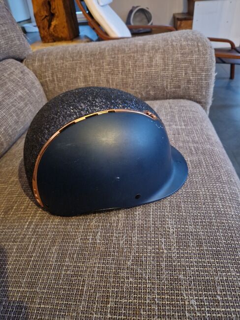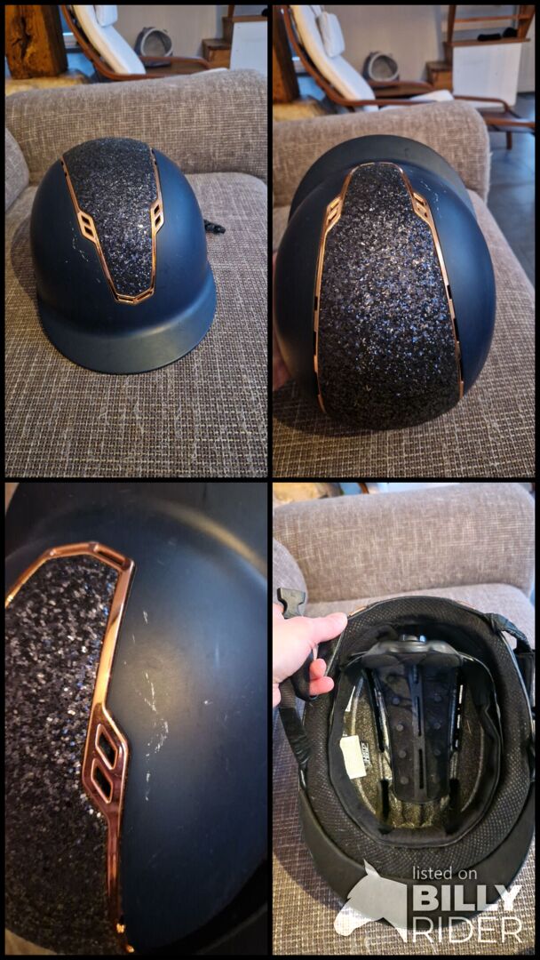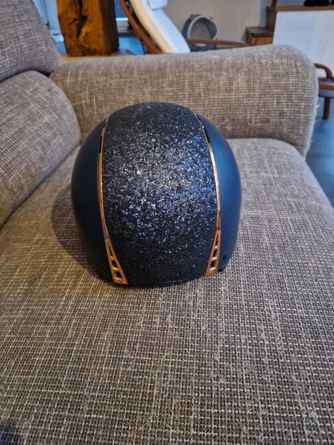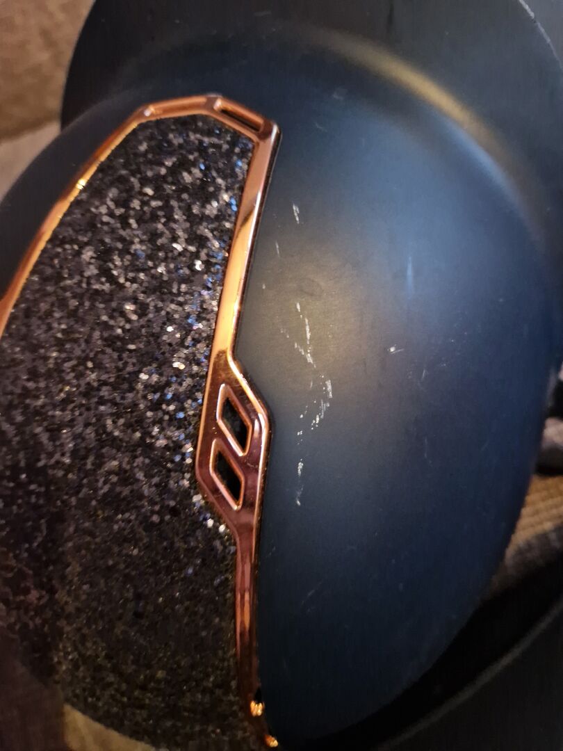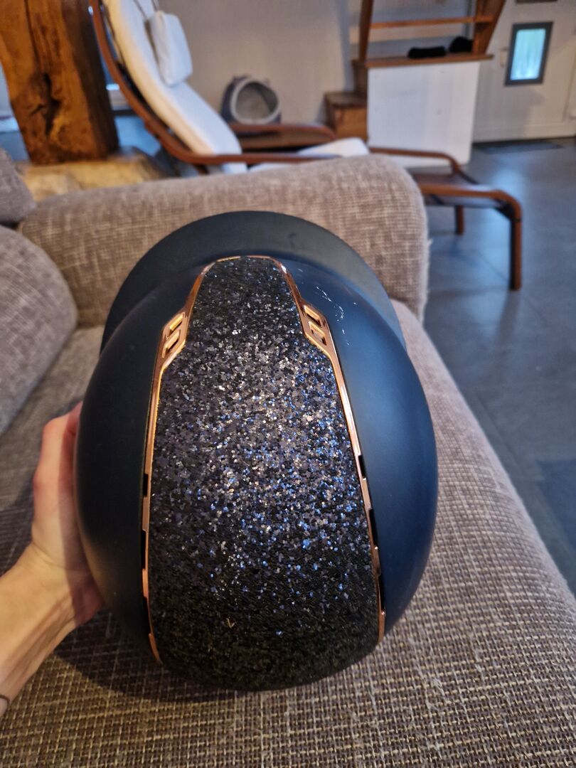 Harry's paardrijhelm blauw roségoud glitter M - De helm is vrij van crashes en heeft een paar krasjes zoals je kunt zien.