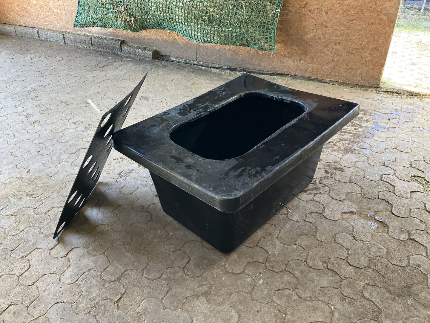 Hay Saver hooikist voor buiten (tweedehands) - De hooikist is in goede staat en volledig functioneel. Afmetingen 110 x 80 x 55 cm. Voeren van hooi overal mogelijk, ook buiten. Zorgt voor natuurlijk voedergedrag dicht bij de grond. Voedertijd kan verlengd worden door een plaat met ronde openingen te plaatsen. Eenvoudig te vullen door schuifdeksel. Vorstbestendig, voedselveilig plastic. Originele prijs 220 Euro