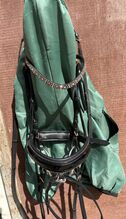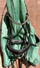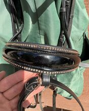 Heinick patent snaffle, snaffle, toernooi, patent, strass, rosé, NIEUW - Super mooie Heinick lak snaffle in zwart met strass steentjes en gespen in rosé! Maat Warmbloed met zacht gevoerde Zweedse neusriem! Ideaal voor show en competitie! Anatomisch, zacht gevoerd kopstuk! Was alleen op het paard voor een fotoshoot en is dus echt NIEUW! Het hoofdstel wordt verkocht inclusief de bijpassende teugels, maar zonder bit!