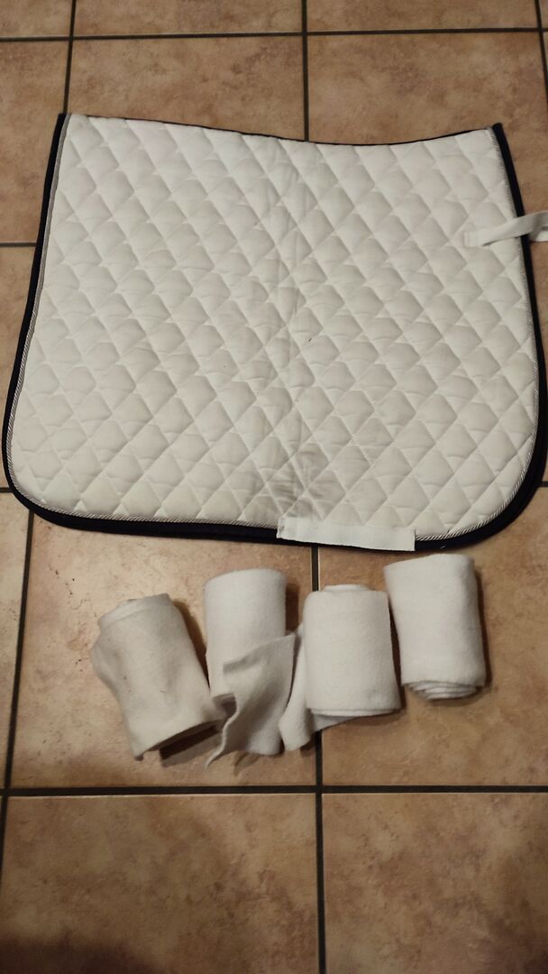 Hennig en Derby Zadeldekje Wit Dressuurverband vanaf €4 - Derby Zadeldekje slechts 8€ Bandages wit set van 4 slechts 4€ Hennig NP 65€ nu slechts 25€ topconditie! Particuliere verkoop, ik sluit elke aansprakelijkheid voor materiaaldefecten uit, geen ruil of vervanging.