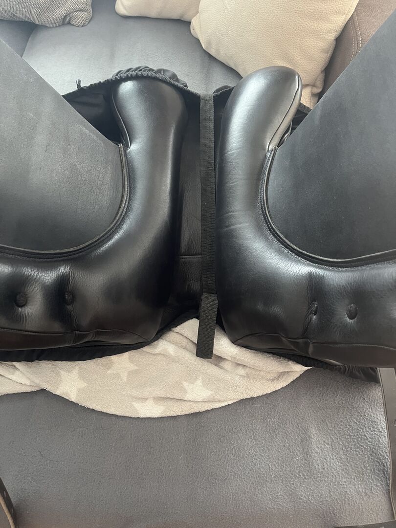 Hermano dressuurzadel - Te koop hier is een gebruikt, nieuw ontworpen dressuurzadel met een halfdiepe zitwelving - speciaal voor onze populaire "brede" paardentypes. De speciaal ontwikkelde zadelboom is ontworpen om te voldoen aan de moderne eisen op het gebied van zitcomfort. Dankzij de aanpasbaarheid van de breedte van de slokdarmplaat biedt het zadel optimale voorwaarden voor een efficiënte aanpassing aan het paard. De met wol gevulde, korte panelen met een overeenkomstig breed paneelkanaal zijn ontwikkeld om de bewegingsvrijheid van het paard te optimaliseren.