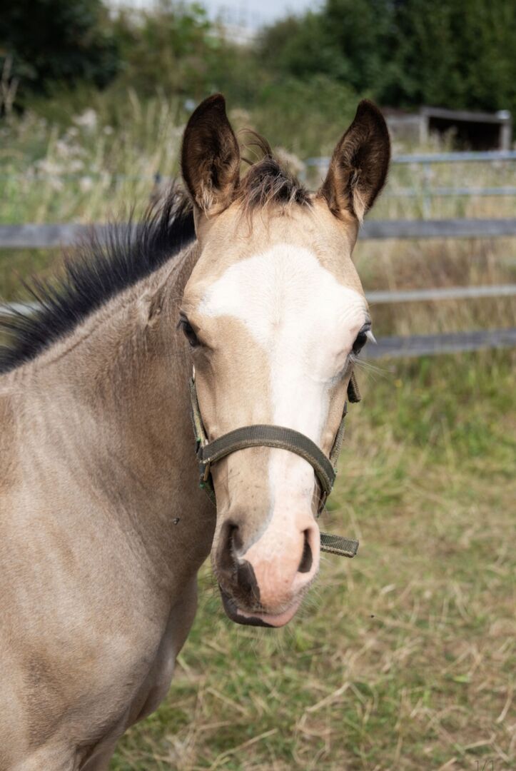 HF Mobster kleinzoon in goudbokskin - Locatie: 42477 Radevormwald Smoking Sugar Socks- deze prachtige Quarter Horse hengst, geboren op 11.5.24, maakt indruk met zijn buitengewone kleur (goudbont) en zijn sterke, correcte bouw. Hij is al groot voor zijn leeftijd. Geschatte uiteindelijke hoogte zal rond de 150 -155 cm zijn. Hij wordt verkocht met volledige AQHA-papieren, die al beschikbaar zijn, en een paardenpaspoort. Hij is gezond en zal opgroeien in een kudde onder de allerbeste omstandigheden. 4-panel n/n en Herda n/p. Hij is ontwormd en gevaccineerd in overeenstemming met zijn leeftijd op het moment van levering. Smoking Sugar Socks kent het veulen al 1x1 en doet het heel goed. Hij heeft een heel lief karakter en is gericht op mensen. Dankzij zijn goede afstamming zal het veulen later een geweldig jong paard worden voor de teugel/all-round arena. Zijn vader is White Mobster, een zoon van de succesvol uitgebrachte HF Mobster. De moeder is gefokt uit Docs Royal Lancer/Double Dip Of Zip. Een geweldige blikvanger in een bijzondere kleur!