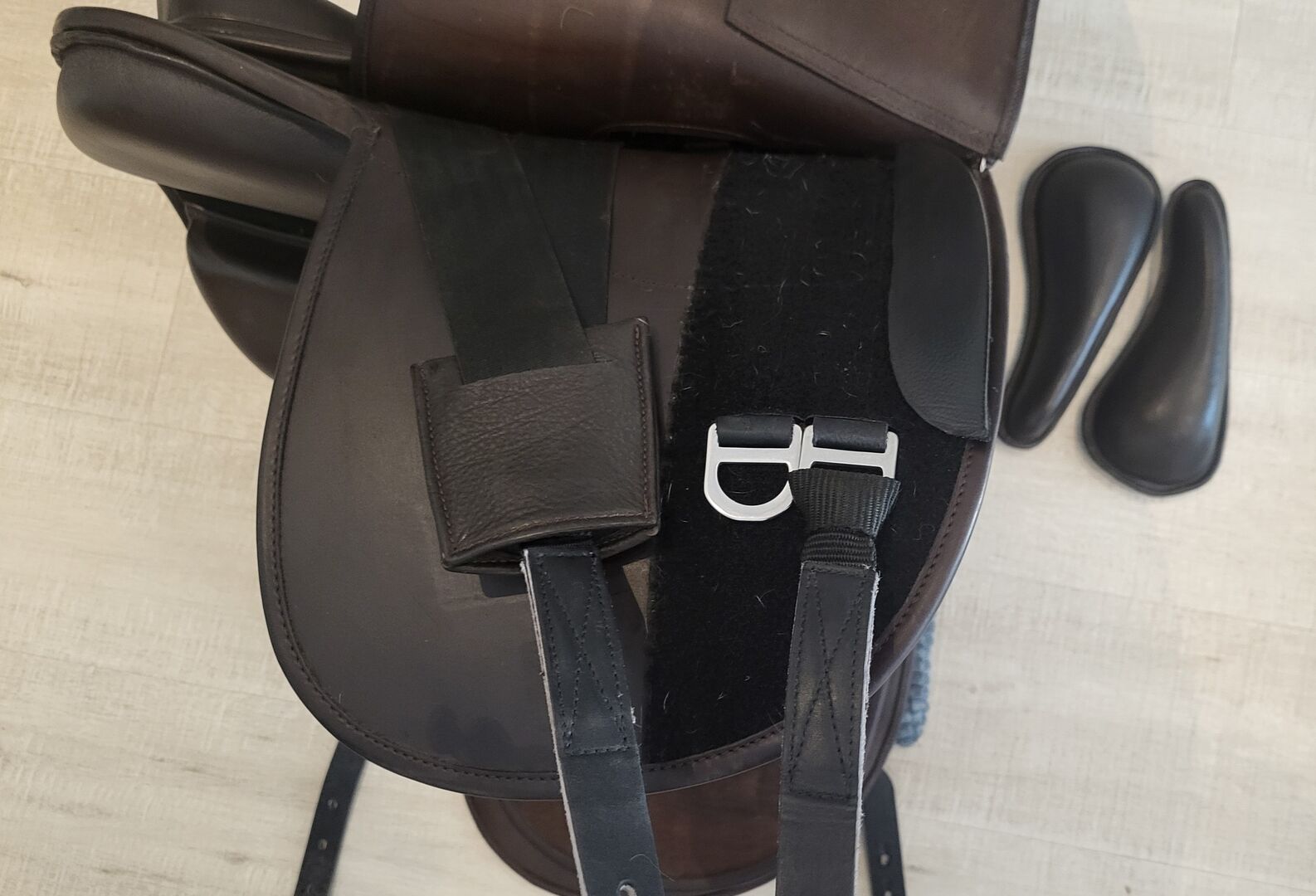 Verkocht met originele zadelhoes, en 2 sets klittenband blokken, de originele waren een beetje groot, ik heb kleinere toegevoegd. Voor de ruiter heeft dit zadel geen erg holle zit, wat veel bewegingsvrijheid biedt en nauw contact met het paard mogelijk maakt. De herpositioneerbare klittenband pads zijn 4 cm dik en 46 cm lang, waardoor het geschikt is voor paarden met een korte rug.