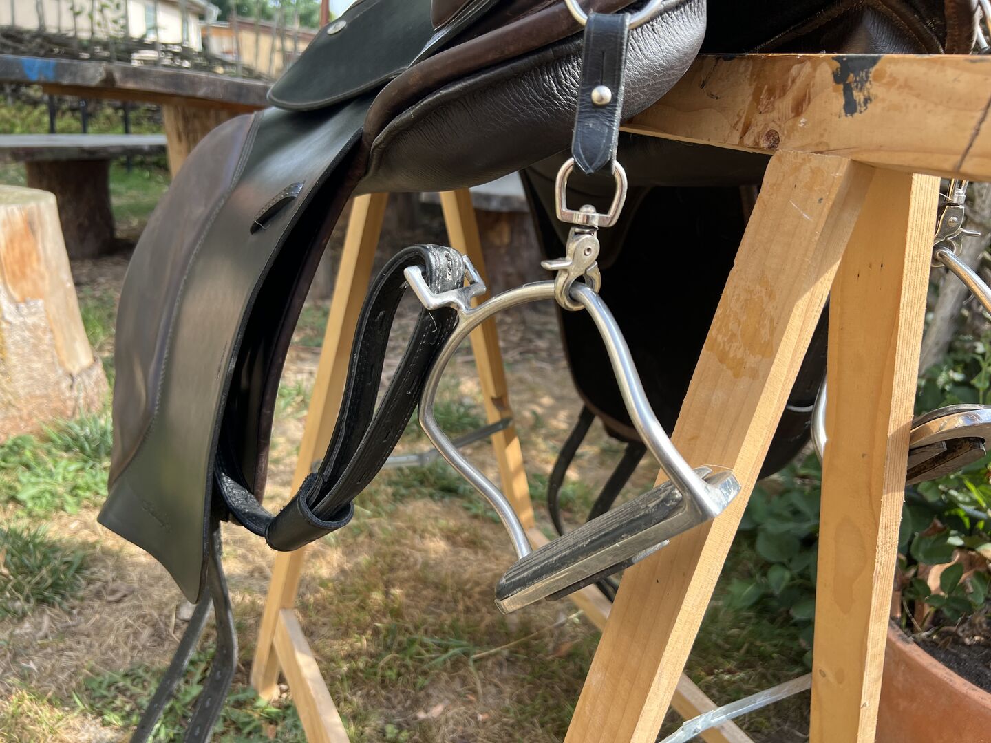 Ook de mono stijgbeugelriemen en de stijgbeugels kunnen worden toegevoegd voor een extra 5,- Euro. De stijgbeugels waren altijd onder de zitting bevestigd, dus er zijn geen sporen van slijtage aan de bovenkant.