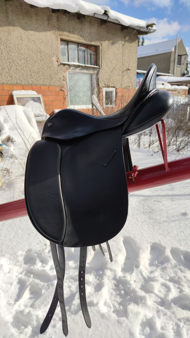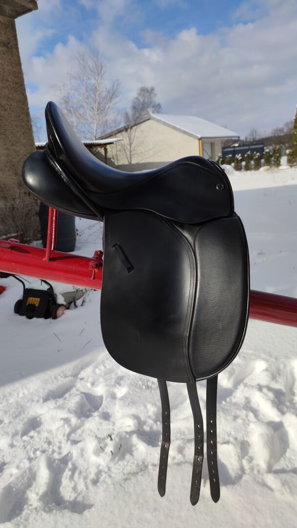 HINTERMAYER Dressuur 17 FIT 3 - Prachtig dressuurzadel in nieuwstaat van Hintermayer, model Anatomic in 17 inch en Fit 3, dus 33/34 kamer. Jaar van fabricage 2008 Korte zitting, met een lichte welving. Het zadel is heerlijk zacht onderlegd. De zitting is zeer comfortabel en de grote klittenband pommels geven extra goede steun in het zadel. Is maar een paar keer gebruikt. NP ca. 2500 Euro. De kamer is origineel en niets is opnieuw opgevuld. Wig panelen wol gevoel Verstelbare slokdarm plaat