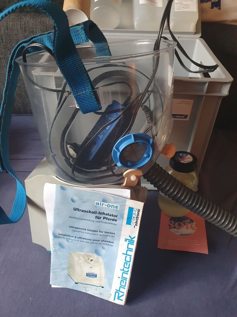 De inhalator wordt geleverd met 13 bekers, 1/3 contactvloeistof, 1 fles gedestilleerd water, desinfectans als concentraat, 1/3 fles NaCl en hoogwaardige Noordzeezool van Horsesupport.