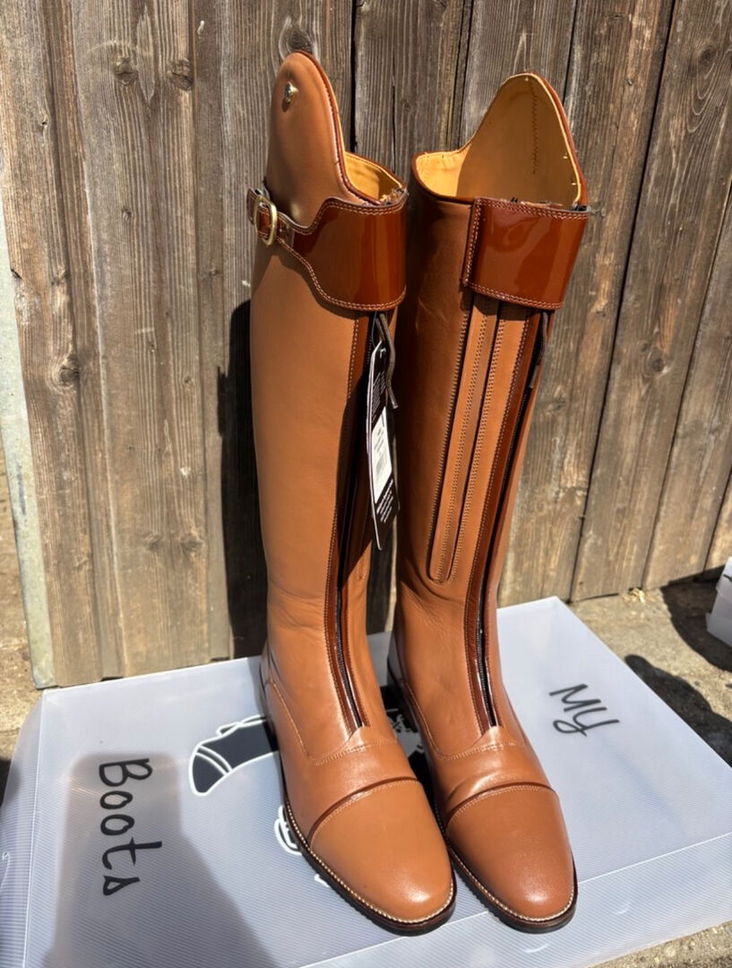 Hkm Liano dressuurlaarzen maat 41 - Te koop zijn prachtige HKM rijlaarzen Liano in de elegante kleur Brandy (maat 41). De laarzen zijn nieuw en ongedragen, slechts één keer gepast - helaas zijn ze te kort voor mij en iets te strak bij de kuit.