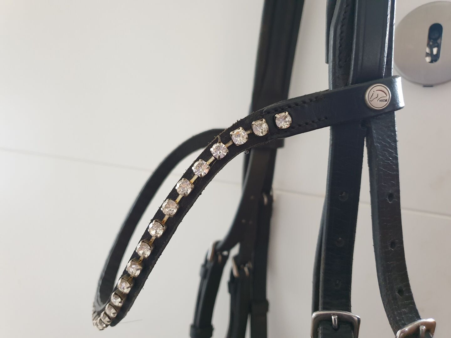 Zilverkleurig, stevig beslag - gesp en mooie wenkbrauwband met synthetische diamanten. Diamanten maken de snaffle een sprankelende blikvanger :)