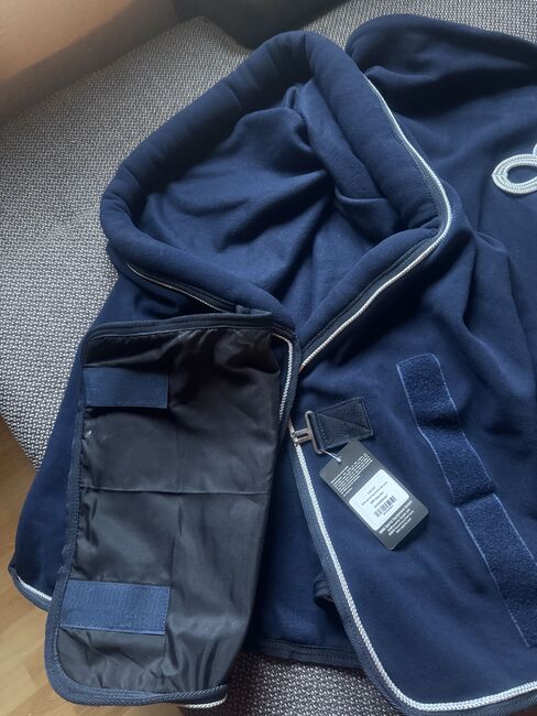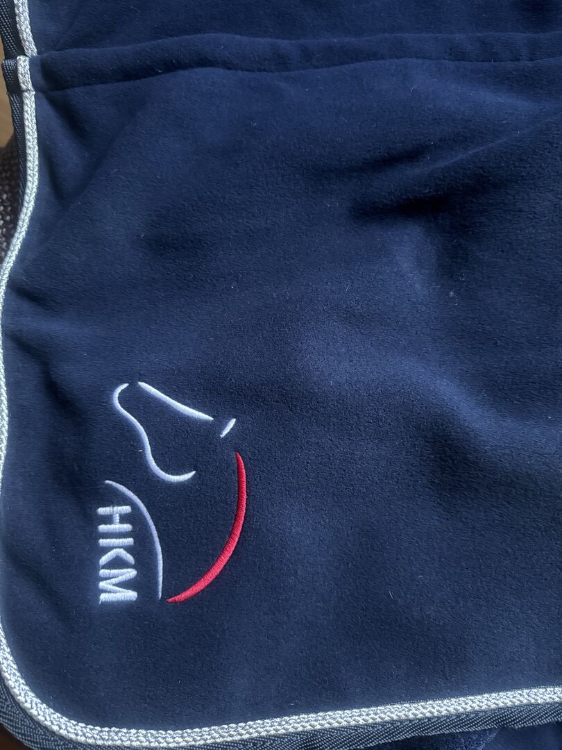 HKM zweetdeken met kraag en slab, 155 cm - Donkerblauwe zweetdeken van HKM met kraag en slab in maat 155 cm Zo goed als nieuw met label Is maar een paar minuten op het paard geweest om te passen.