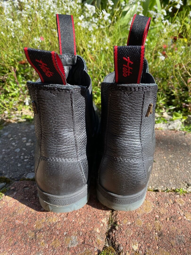 Stevige leren enkellaars, zwart met zwarte elastische banden, 2 contrastkleurige lipjes voor een gemakkelijke instap. Maat 38.