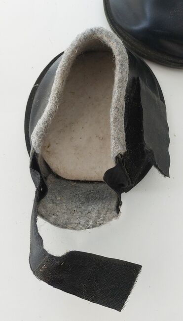 Hoefschoenen Engl - De optimale vorm maakt het gemakkelijk om de hoefschoen aan te trekken, zelfs als het paard een hoefverband moet dragen. Dit maakt normaal bewegen en wandelen in de paddock mogelijk. De omgevouwen snede voorkomt dat vuil, modder of stenen enz. tussen de zool van de hoefschoen en de zool van de paardenhoef komen. De 10 mm dikke rubberen zool beschermt tegen punctuele druk (grindpistes, wegen enz.). Daarnaast kan er een 12 mm dikke vilten inlegzool in de schoen worden aangebracht voor verdere demping. De hoefschoenen kunnen ook voor langere tijd op de hoef blijven zitten, zodat er geen hoefverband of gipsschoenen nodig zijn. Maat: WB (binnen gemeten) 17x14cm, (gemeten aan de buitenkant) 18,9x16,5cm Hoogte van de schoen aan de voorkant van de hoef 11,6 cm Door de brede klittenbandsluiting kan de schoen gemakkelijk worden aangepast. In zeer goede staat!