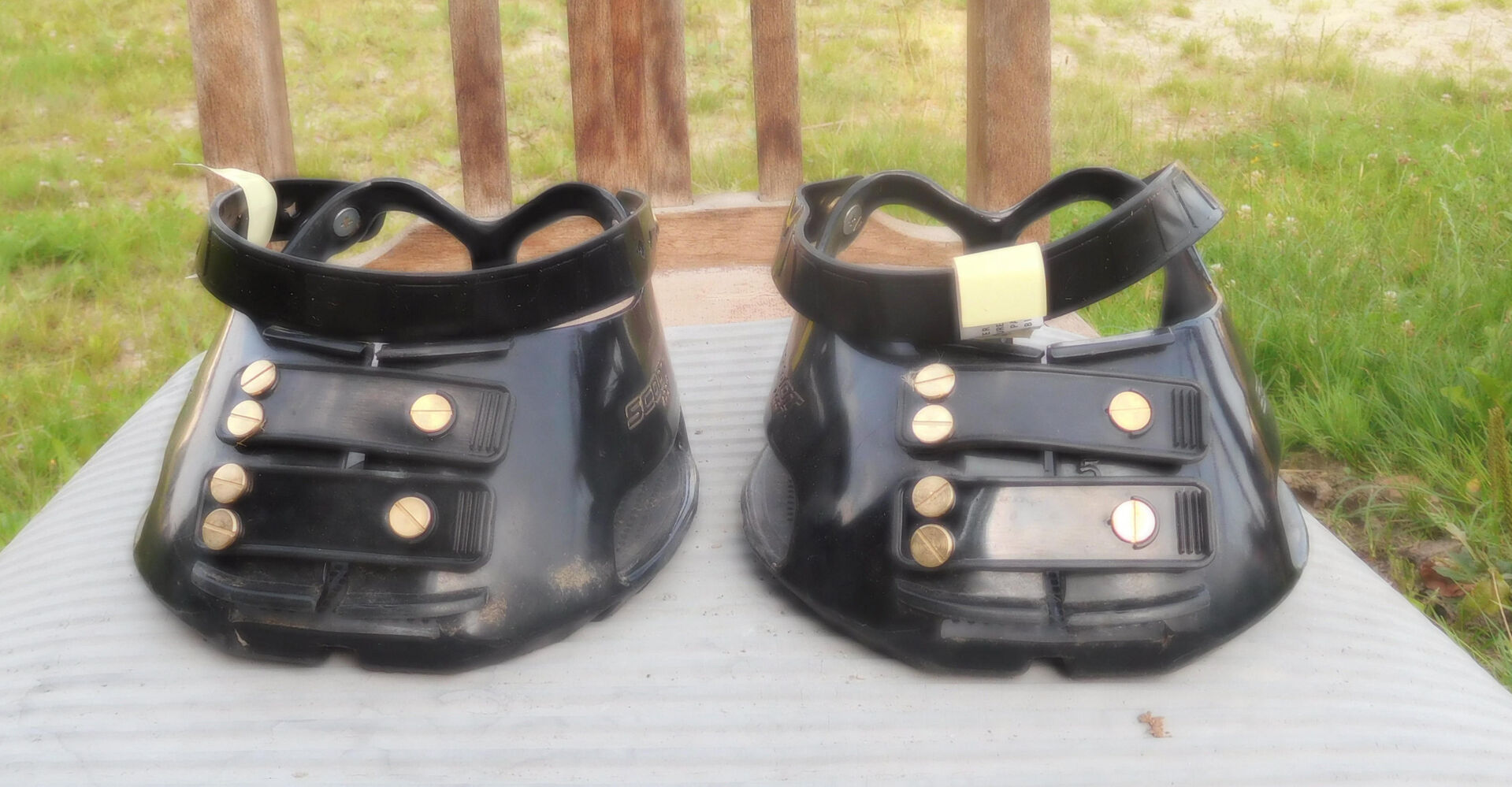 Hoefschoenen/hoefbescherming alternatief voor hoefijzers - Hoefschoenen / hoefbescherming: Hoefschoenen van het merk Scoot Boots Maat: 5 Zwart /Zwarte banden Balen bescherming Nieuw zaten de schoenen alleen op de hoef voor een passing. Deze hoefschoenen zijn echt goed. Wat maakt ze beter dan de andere? De grip op de hoef is erg goed. De bal van de hoef heeft veel vrijheid. Dat is vaak een probleem met andere schoenen. Het is heel gemakkelijk aan en uit te trekken. Goede zool met goede grip Geleverd met extra bandjes in zwart & extra korte bandjes ook in zwart. Gelieve correct te meten. Schoenen kunnen niet geretourneerd worden. Geen garantie. Prijs incl. verzendkosten