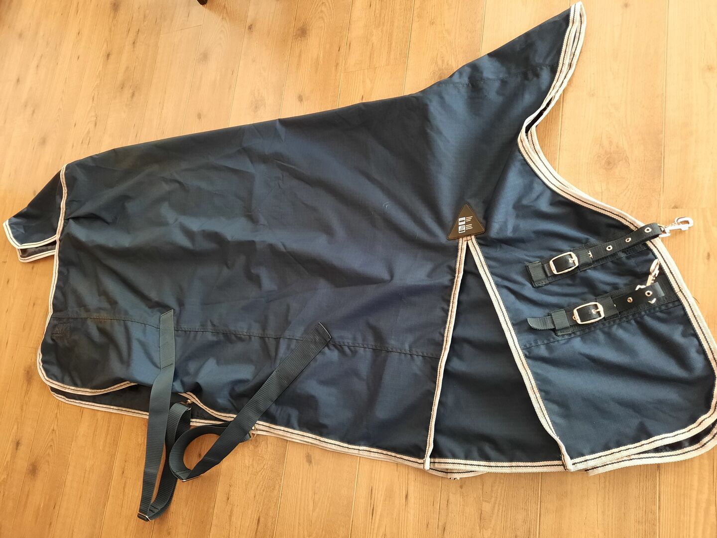 Hoge hals regendeken - Regendeken Highneck van Finntack in 135cm, fris gewassen en nieuw geïmpregneerd. Geen gaten of scheuren. Ook de binnenkant zonder gebreken. Alle sluitingen werken perfect en zijn origineel. Met beenribben, kruissingels, twee borstgespen en staartriemen.