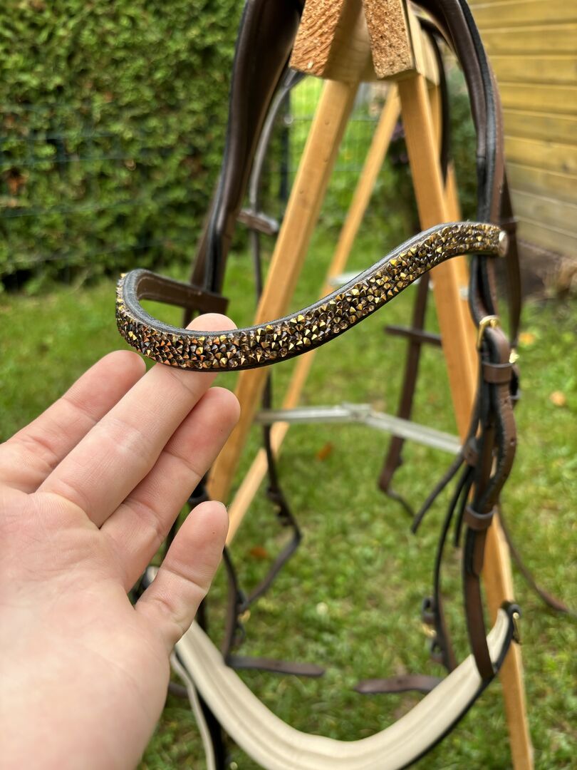 Hoofdstel bruin - Ik verkoop een gebruikte, maar zeer goed onderhouden snaffel van QHP in maat warmbloed. Hij is regelmatig gebruikt, maar altijd zorgvuldig verzorgd en verkeert in zeer goede staat. Er zijn normale, lichte gebruikssporen, maar geen enkele schade.