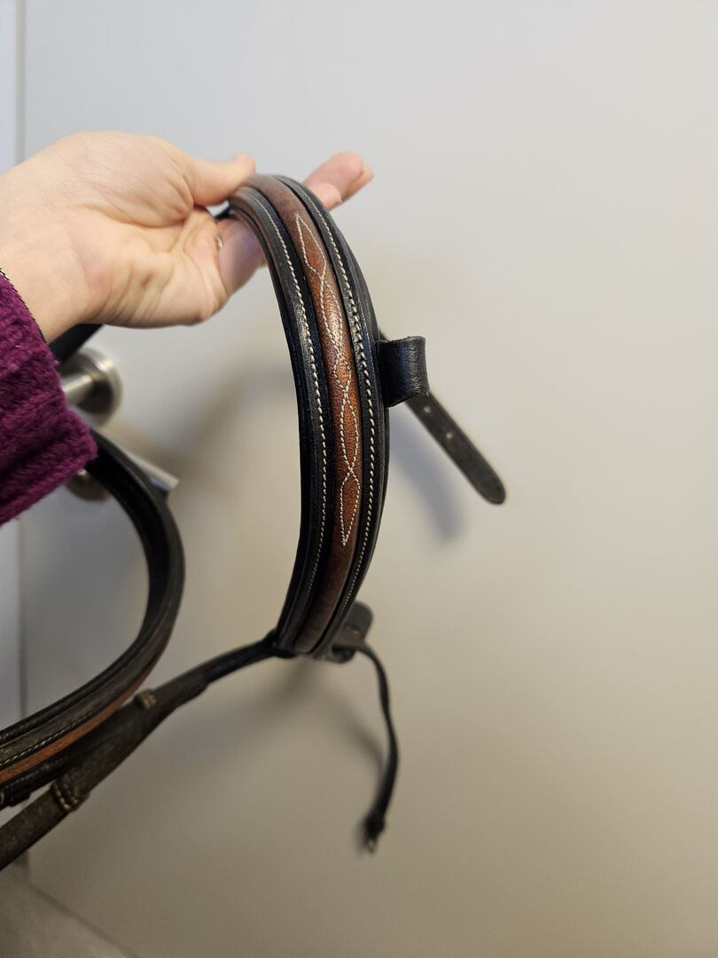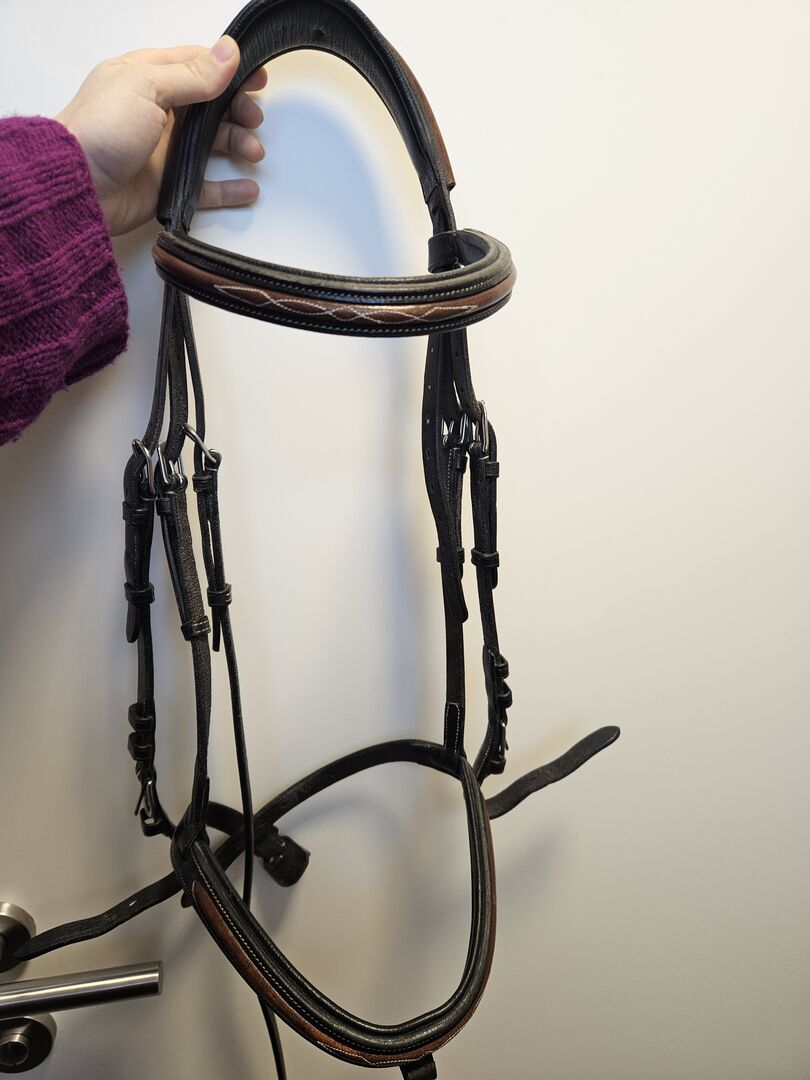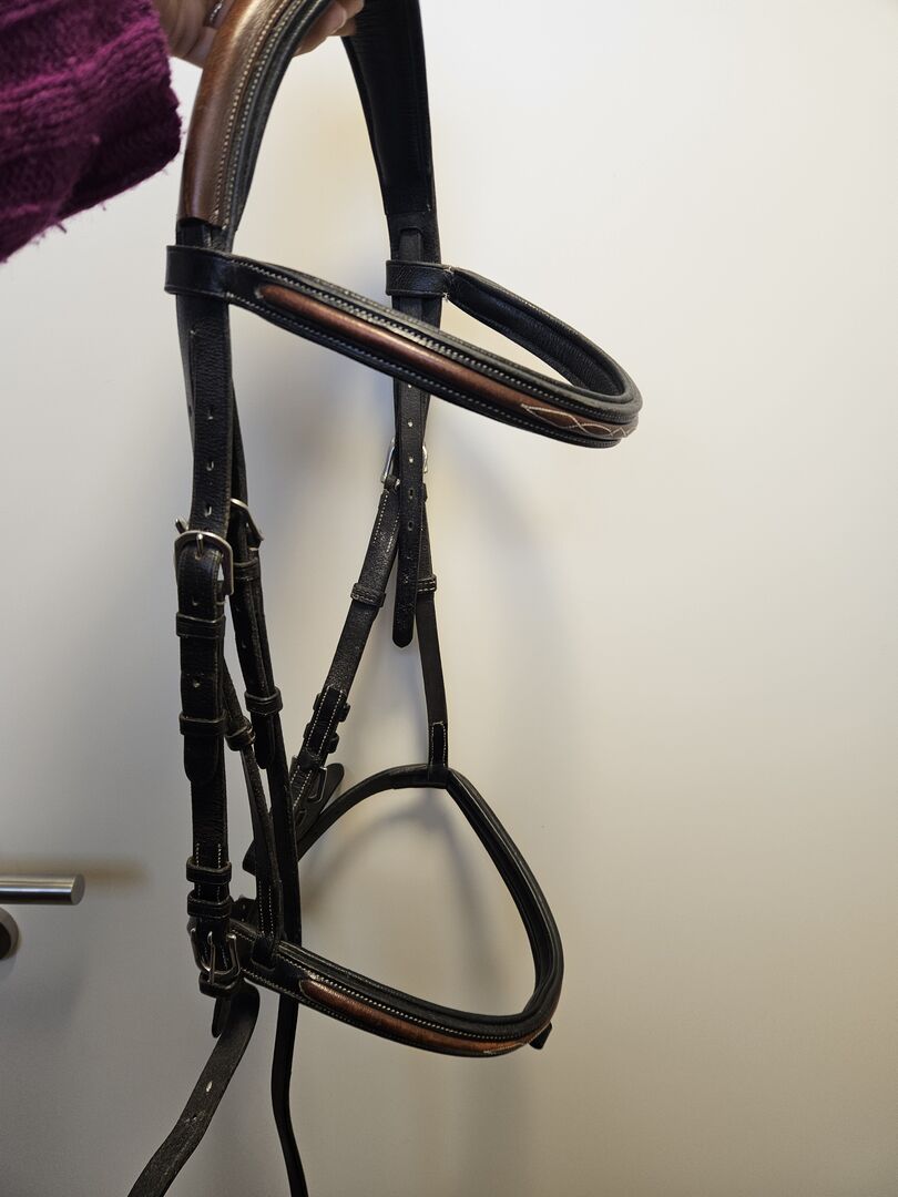 Hoofdstel bruin zwart - Hoofdstel in zwart met bruine accenten. Goed verzorgd en compleet. Maat warmbloed/volbloed
