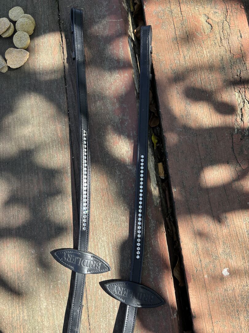 Hoofdstel Hoofdstel Verlof - Te koop is de Bridlery snaffle in de maat Cob en in de kleur zwart zonder frontriem. Het kopstuk is met keelriem en met halsreliëf. Wangstukken (hoofdstelhaken). De teugels zijn van leer. Ultra zacht en met glitters.
