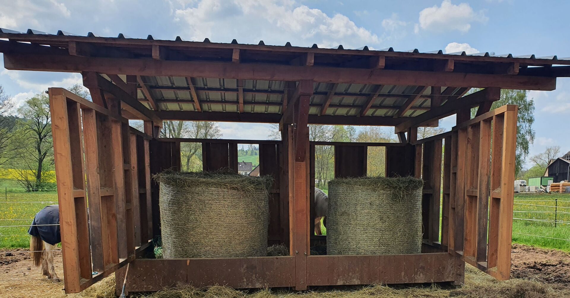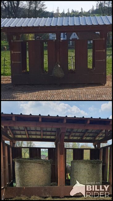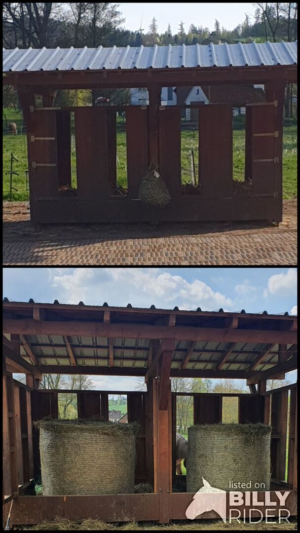 Hooiruif met 12 voederplaatsen - Te koop een hooiruif met 12 voederplaatsen. Er passen precies 2 ronde balen in. De binnenafmetingen zijn 2x 4 meter en het dakoppervlak is 5x6 meter. De hooiruif is eenvoudig te demonteren. Voor zelf demonteren. Locatie 36287