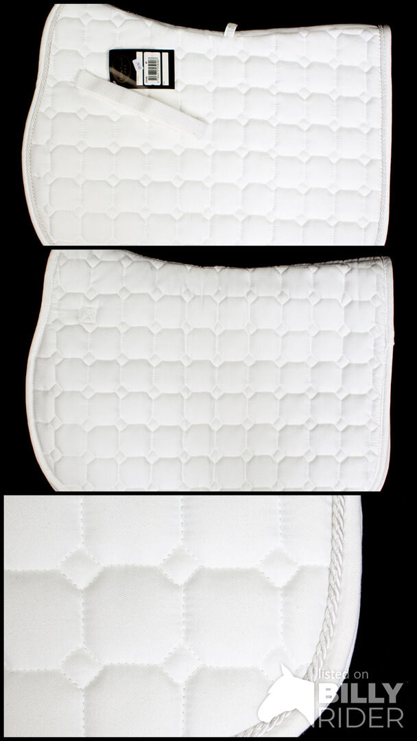 Horse Guard Zadeldekje wit PD - Dit mooie en klassieke pony dressuur zadeldek van Horse Guard is perfect als wedstrijd zadeldek. De rand is versierd met een mooi wit koord, waardoor het een echte blikvanger op de show wordt. Het witte zadeldek is nieuw met label. De oorspronkelijke prijs was 29,95€.