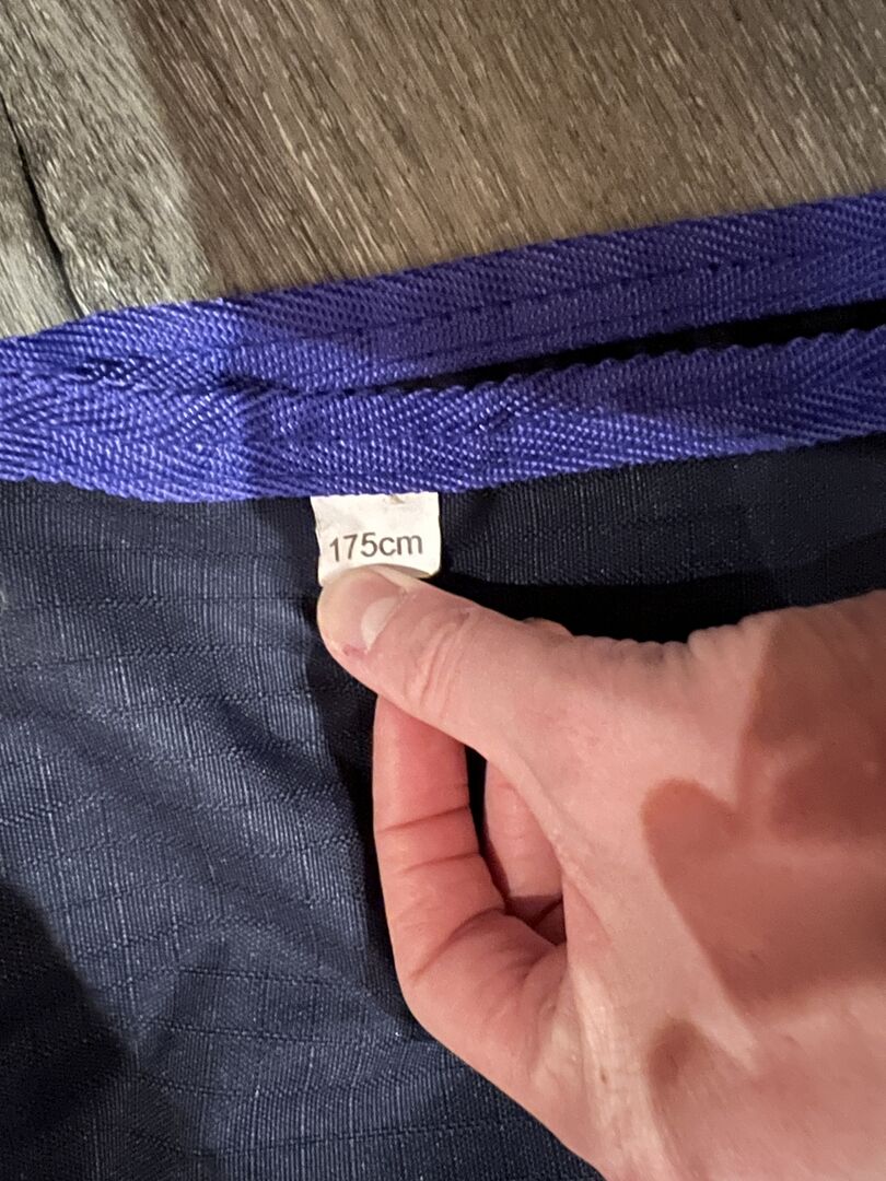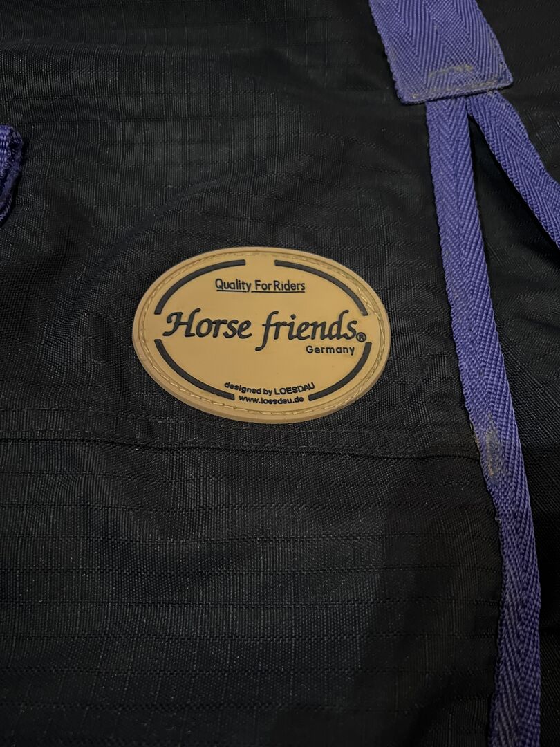 Horsefriends deken voor buiten 175 - Te koop hier een gebruikt maar in goede staat verkerend outdoor vloerkleed van het merk Horsefriends by Loesdau. De deken is absoluut waterdicht, zou alleen na het wassen opnieuw geïmpregneerd moeten worden. De deken is fris gereinigd met ontsmettingsmiddel. Helaas weet ik het exacte aantal grammen niet, maar ik schat dat er ongeveer 50 gram in zit. Het heeft geen fleece voering. Ik heb een van de karabiners van de voorste sluitingen moeten vervangen omdat deze defect was. De naad van een van de buikriemen is een keer gerepareerd, maar de buikriem houdt heel goed en het is mijn paard niet gelukt om hem weer te verwijderen.