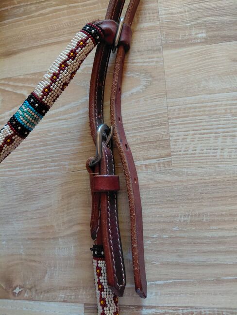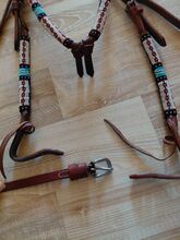 Horsetack Indian Blue Snaffle - Prachtige parelapplicatie. NP 75€ Snaffel gemaakt van Amerikaans tuigleer van hoge kwaliteit Volledig met de hand gemaakt De western snaffle is uitgebreid versierd met de mooiste parels Sluiting aan het bit met binddraad (leren koorden) Verzending mogelijk tegen meerprijs. Neem contact met ons op als je vragen hebt.