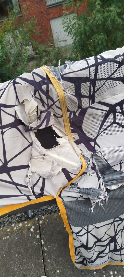 Te koop Horseware vliegendeken model CamoFly in 155cm ruglengte (zonder halsdeel) die gerepareerd moet worden. De deken heeft verschillende gebreken aan de achterkant van de staartflap en croupe gebied als gevolg van schuren (zie foto's). Met geduld en een beetje naaitalent kan het zeker gerepareerd worden. Gedetailleerde foto's op aanvraag