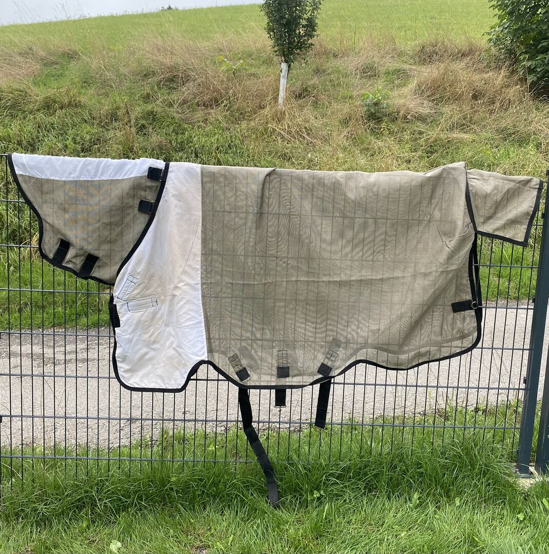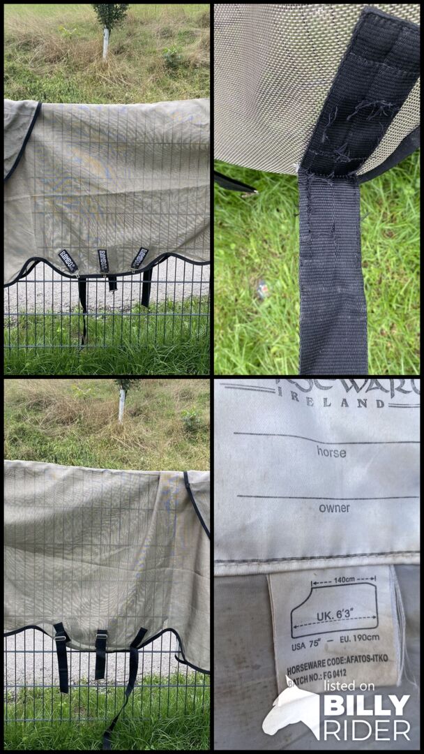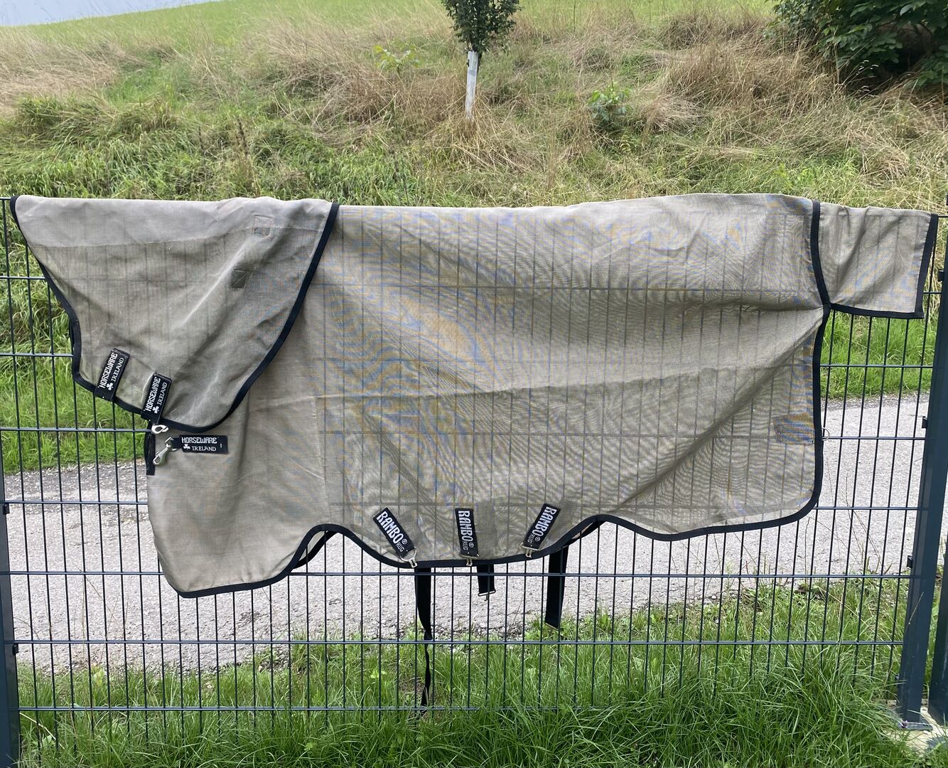 Horseware Rambo Vamoose Vliegendeken 140cm - Te koop is een vliegendeken van Horseware. De deken is gemaakt van een sterk materiaal dat luchtcirculatie toelaat en niet wegglijdt. Aan de binnenkant is een gladde stof genaaid in de schouder- en manenkam om gebroken haren of schuren te voorkomen. Het afneembare halsstuk is maat M. Het enige nadeel is de gescheurde buikband aan de voorkant. Ik heb het gewoon dichtgeknoopt en slechts twee van de drie buikriempjes gebruikt.