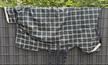 De deken is gebruikt voor de open stal en is professioneel gereinigd. Helaas is de voorste buikband beschadigd tijdens het schoonmaken, maar dit heeft geen invloed op de pasvorm van de deken. Neem contact met me op als je vragen hebt :)