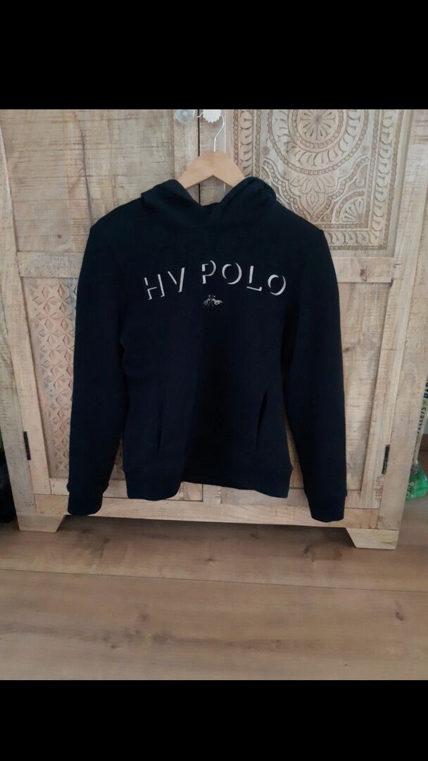 HV Polo Hoodie donker - Hoodie van HV Polo in zwart, maat L. Met print en borduursel op de voorkant en 2 steekzakken. Fluweelzachte binnenkant. Verzorgd en altijd gewassen met mild wasmiddel, zeer goede staat. Met 3 reserve steentjes.