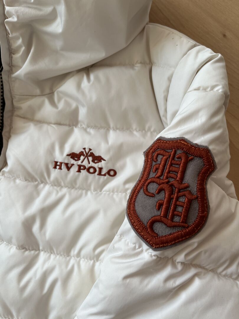 HV Polo Winterjas - Witte winterjas van HV Polo met bontkraag. De jas heeft twee buitenzakken en één binnenzak. Helaas zit er nog een vlek op de achterkant, maar die is maar een klein beetje zichtbaar. De jas wordt geleverd met een dunne riem.