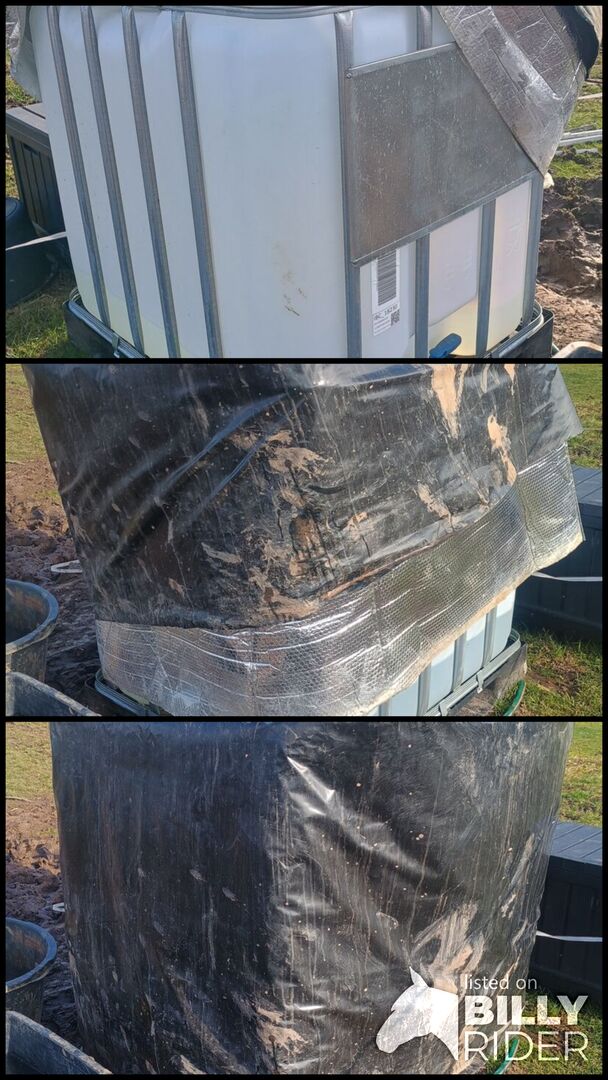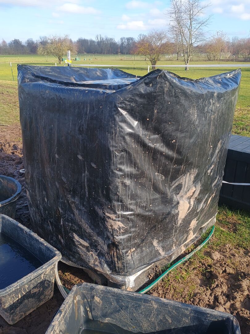 IBC container 1000 liter incl. vorst- en UV-beschermingscoating - Ik verkoop een 1000 liter IBC-tank inclusief bijpassende aluminium/UV-beschermhoes. De tank is slechts 6 maanden oud en heeft alleen normale gebruikssporen. Hij werd gebruikt als watertank voor paarden en er wordt een zelfbewateringsbak meegeleverd voor installatie.