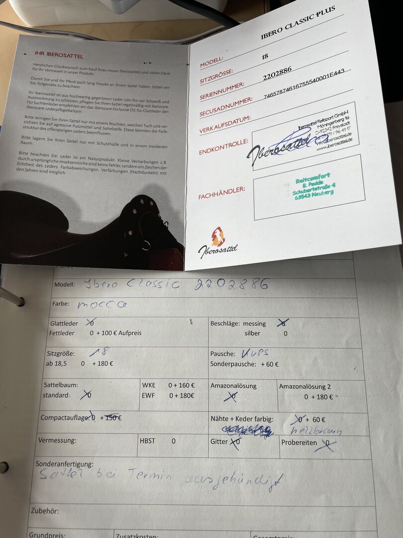Ibero Classic Plus geproduceerd door Sommer 18" barok/fretzadel - Te koop is een weinig gebruikte Ibero Classic Plus (fabricaat Sommer) met afneembare achtergalerij. Gekocht in augustus 2022, als dubbel zadel. Kleur donkerbruin/mocca, biezen en stiksels lichtbruin. Incl. Comfort-Compact onderlegger, Amazone oplossing en Secusad systeem.
