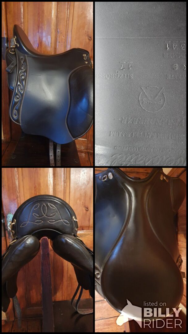 -nauwelijks gebruikt, zo goed als nieuw -zie foto's Kleur: mokka, sierstiksels - champagne Zitmaat: 17,5 inch, diepe zit, extra zacht Knierollen: Knierollen met klittenband V-Flex singel Medium ondersteuning (48 cm) Beslag: Messing WKE boom