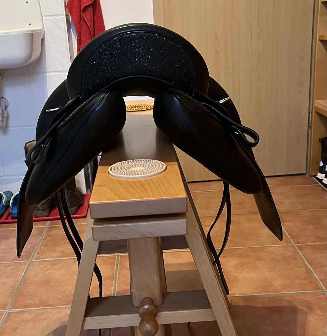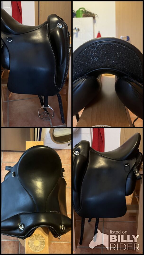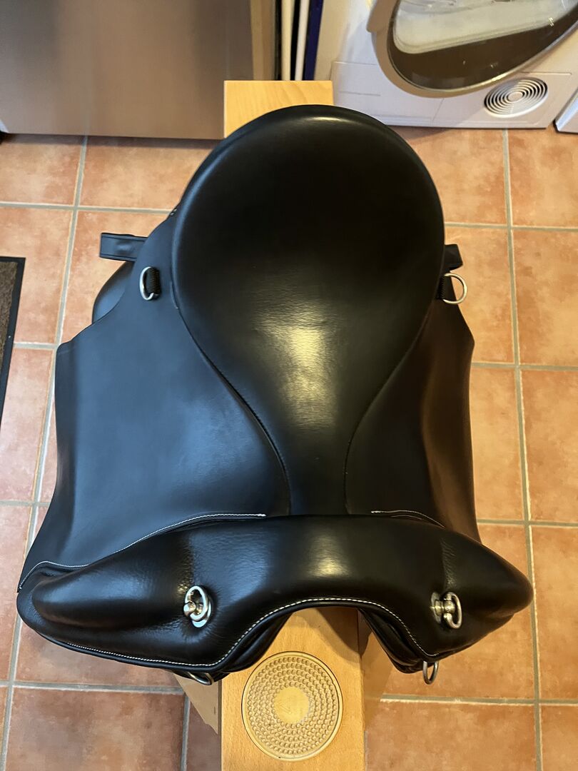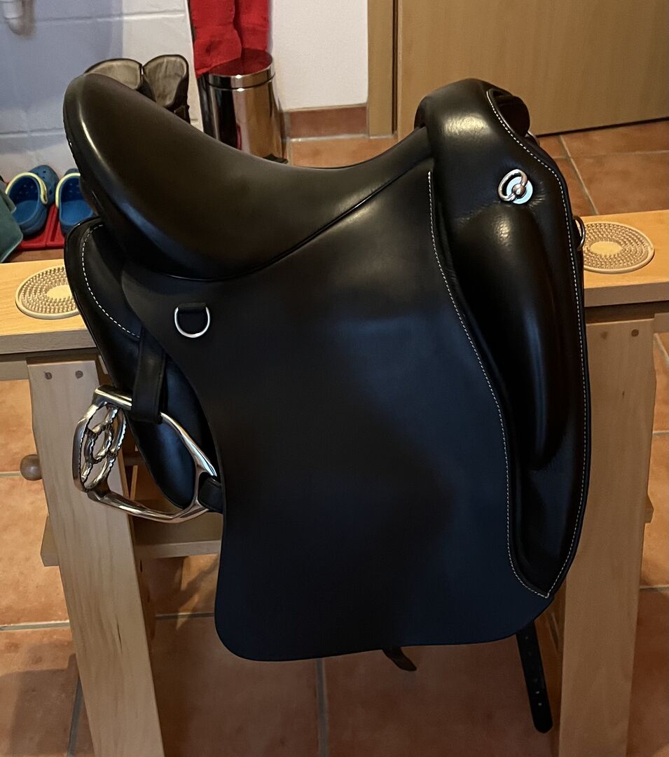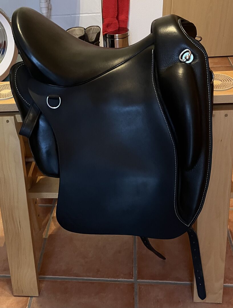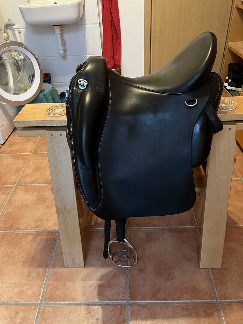 Ibero zadel Alpha Vaquero - Te koop een Ibero zadel model Alpha Vaquero met een zitmaat van 17,5 inch en een kamerbreedte van 31,5. Het zadel is ongeveer een jaar oud en zeer goed onderhouden, dus zo goed als nieuw. Stijgbeugels, stijgbeugelriemen en verzorgingsolie worden meegeleverd. Tekst van de fabrikant: Gebouwd op een dressuurboom is de Alpha Vaquero ondanks zijn zachte, vlakke zit een ideaal zadel voor dressuurwerk. Dankzij de grote, zachte vaquero flap, die ook dienst doet als voorgalerij, is het ook geschikt voor cross-country en bijvoorbeeld als werkzadel voor equitation. De Comfort-Compact panelen maken het mogelijk om het zadel aan te passen aan bijna elk paard. Het is bijzonder geschikt voor vierkante paarden of pony's.