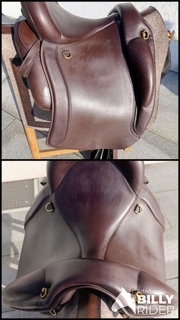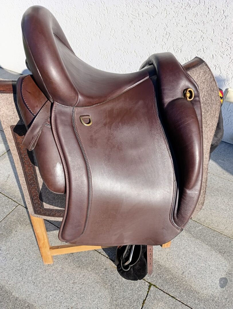 Ibero zadel Doma Classica - Het is echt een geweldig Ibero zadel. Helaas past het niet meer op onze Mucki. De grote, zachte knierollen maken het ideaal voor werkpaarden. De van het zadel gevormde achtergalerij omsluit de ruiter zachtjes en geeft een veilig gevoel in het zadel. Dressuur rijden is ook geen probleem. Je zit laag in het zadel en kunt de hulpen direct overbrengen. Het is standaard uitgerust met het korte Comfort-Compact zadeldek (lengte zadeldek: 44 cm) en past daarom ook op "korte" paarden. Gewicht: 7 kg Zitmaat: 17,5 (maar lijkt meer op 17,0) (Internetadres: https://www.iberosattel.de) Nieuwe prijs: 4.590€ Ik bied ook de bijpassende pad aan die als nieuw is en ook meer dan €300 kost. Opmerking: Ophalen heeft de voorkeur - verzenden is mogelijk. De verzendkosten zijn echter voor rekening van de koper.