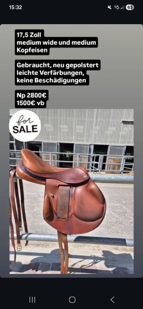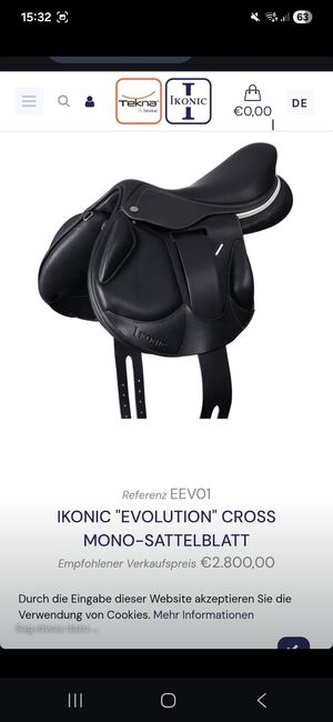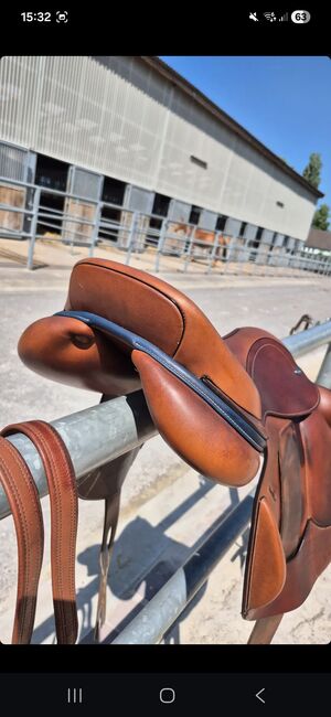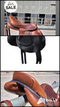 Ikonic "Evolution" cross springzadel/cross country zadel - Zeer veelzijdig, aanpasbaar spring/cross-countryzadel. 17,5 inch Cognacbruin met donkerblauwe doorstiksels Nieuw opgevuld Zichtbare gebruikssporen (verkleuring), geen beschadigingen Incl. stijgbeugelriemen en 2 schedels (medium en medium breed)