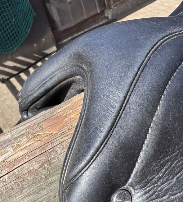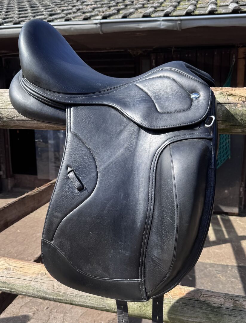 Ikonic Light dressuurzadel mono flap 18" - Ik verkoop mijn Ikonic dressuurzadel. Het zadel heeft een mono flap en een zitmaat van 18". Tekenen van slijtage zoals te zien is op de foto. Er is een zwart slokdarmplaatje gemonteerd. Helaas past het zadel niet meer op mijn paard. Neem contact met me op als je vragen hebt
