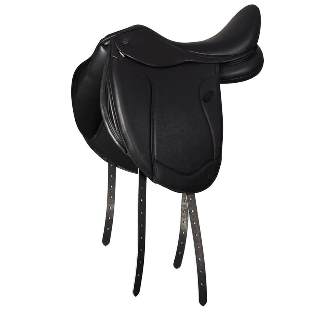 Ikonic zadel Light Hybrid Dressuur - redelijk geprijsd dressuurzadel van Ikonic met mono flap V-girthing, wat ervoor zorgt dat de eerste slok automatisch op de juiste plaats komt te liggen voor elk paard gemaakt van natuurlijk leer en kunstleer rundleer in het optische (zichtbare) gedeelte alle niet-zichtbare delen zijn gemaakt van kunstleer zadelpanelen gevuld met wol en opgevuld voor een perfecte pasvorm met klittenbandsysteem diepe zit