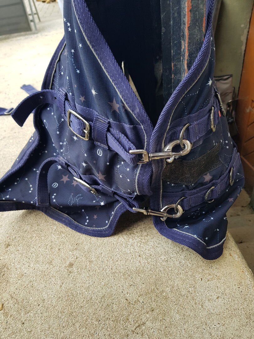 Imperial rijdeken 150 gr, 145cm - In blauw met sterren, maat 145 cm, met hoge hals (totaal 195 cm, staat op het label). Gebruikt, in goede staat. Pas gewassen en geïmpregneerd. Binnenkant glad, geen fleece. Helaas weet ik niet meer hoeveel vulling de deken precies heeft, gok 150 gram. Er zitten nog een paar vlekken op de rand die er niet helemaal uit gingen in het fijne wasprogramma, zie foto. Bij mij zat hij altijd strak.