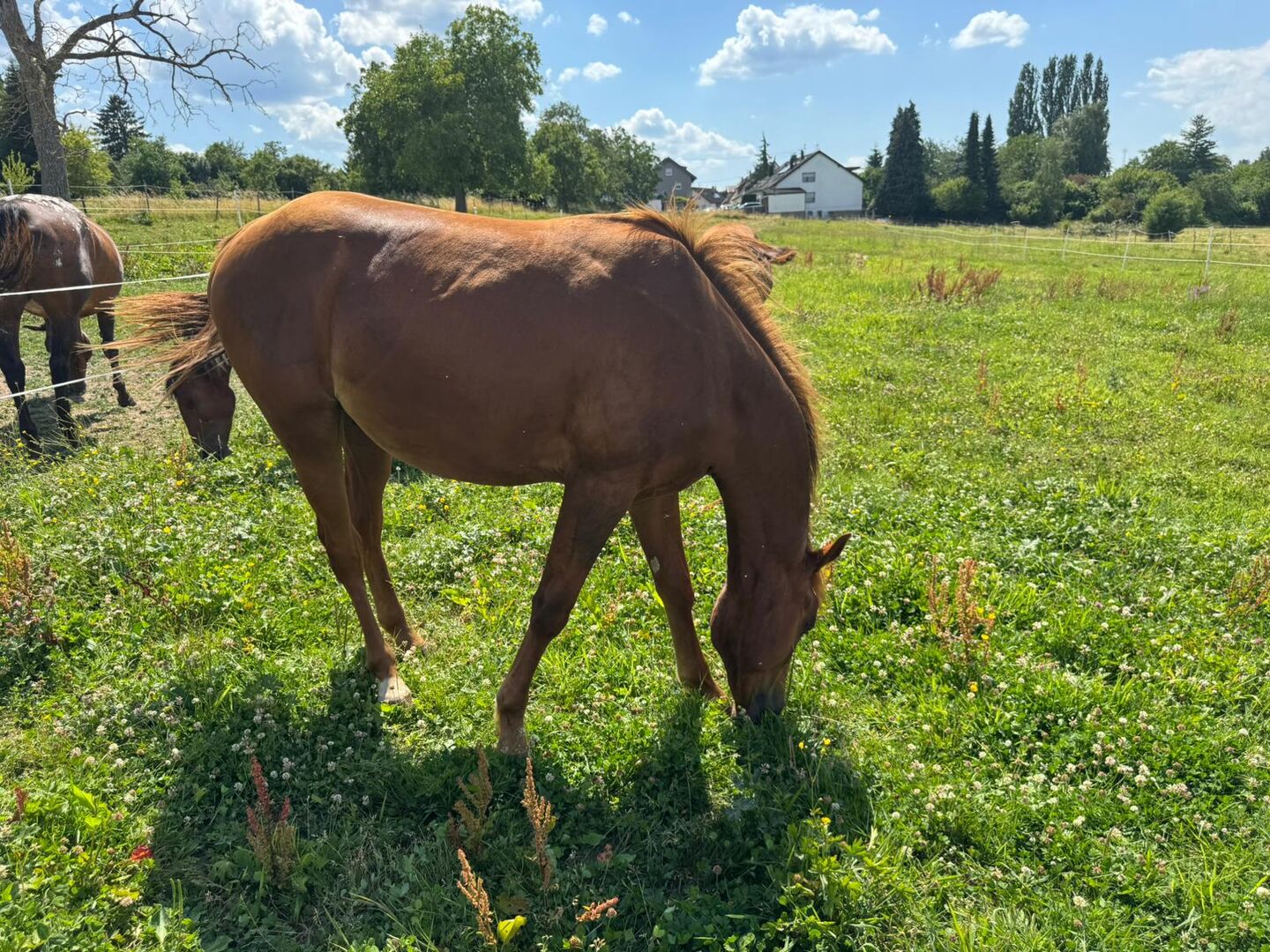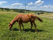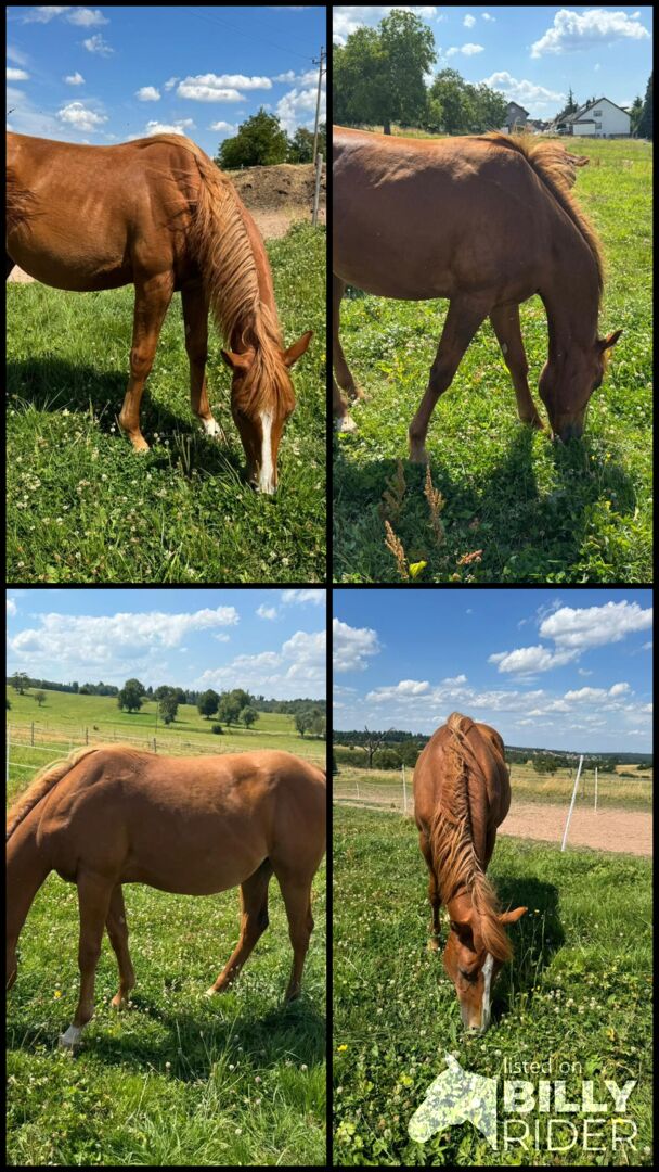 SW At Cody Be Chic is een Quarter Horse hengst geboren op 11.05.2024 in de kleur sorrel met een huidige stokmaat van 134 cm en een geschatte stokmaat van ca. 156 cm. Hij is mooi, zeer goed ontwikkeld en correct gebouwd, met veelbelovende verhoudingen. De jonge hengst is gezond, 6-panel n/n, ingeënt en ontwormd volgens zijn leeftijd en wordt regelmatig aangeboden bij de hoefsmid. Hij groeit op in een soorteigen omgeving in een open stal en is zeer compatibel in de kudde. Zijn karakter is bijzonder aangenaam: hij is mensgericht, nieuwsgierig en knuffelig, speels, gelijkmatig van aard en zeer goed van vertrouwen. Hij is lief, staat open voor nieuwe dingen en is ongecompliceerd in zijn dagelijkse gedrag. SW At Cody Be Chic is halstertrainer, kent het veulen-ABC en is al gewend aan het trailer rijden. Dankzij zijn goede reining en allround afstamming heeft hij de beste voorwaarden voor zowel sport als veelzijdige verdere training. AQHA-papieren en een paardenpaspoort zijn natuurlijk aanwezig. To the seller's offerlaunch