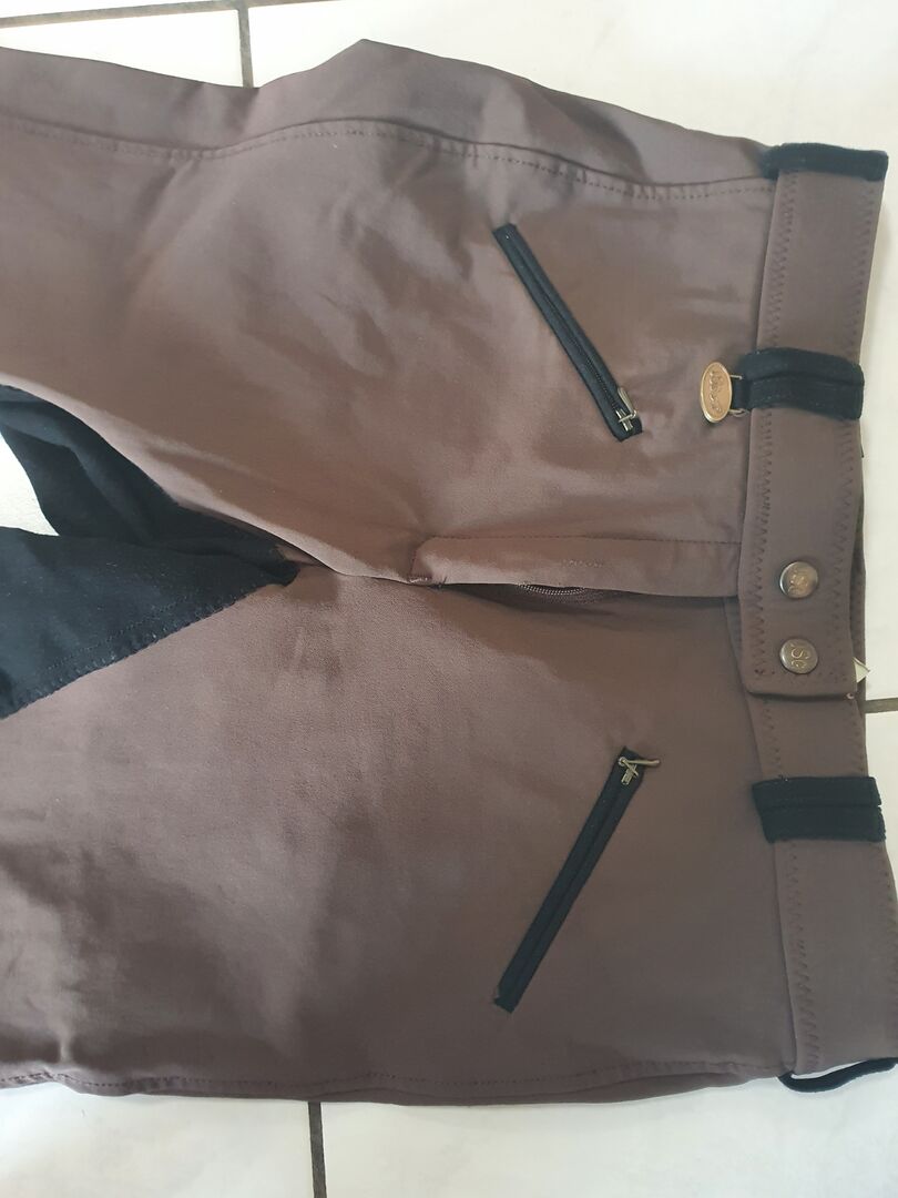 Jodhpur rijbroek van USG bruin-zwart - Zelden gedragen jodhpur rijbroek van USG in maat 42 te koop. Helaas zit er pilling op het zitvlak en op de dijen, ik denk dat het komt door de bontbekleding van mijn zadel. Voor de rest is de bruine broek met de zwarte bies in prima staat, ik rijd alleen liever met een rijbroek.