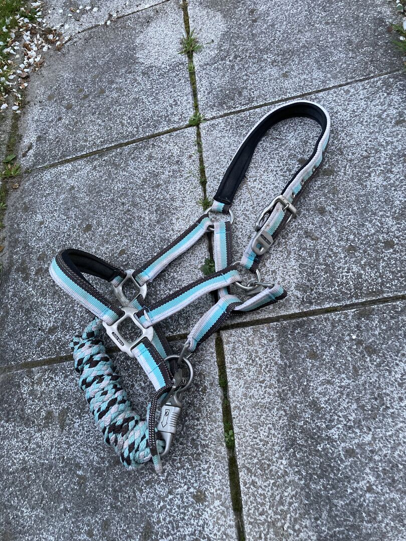 John Webb halster (turkoois)+ touw - Hierbij verkoop ik dit John Webb halster in turkoois met touw.