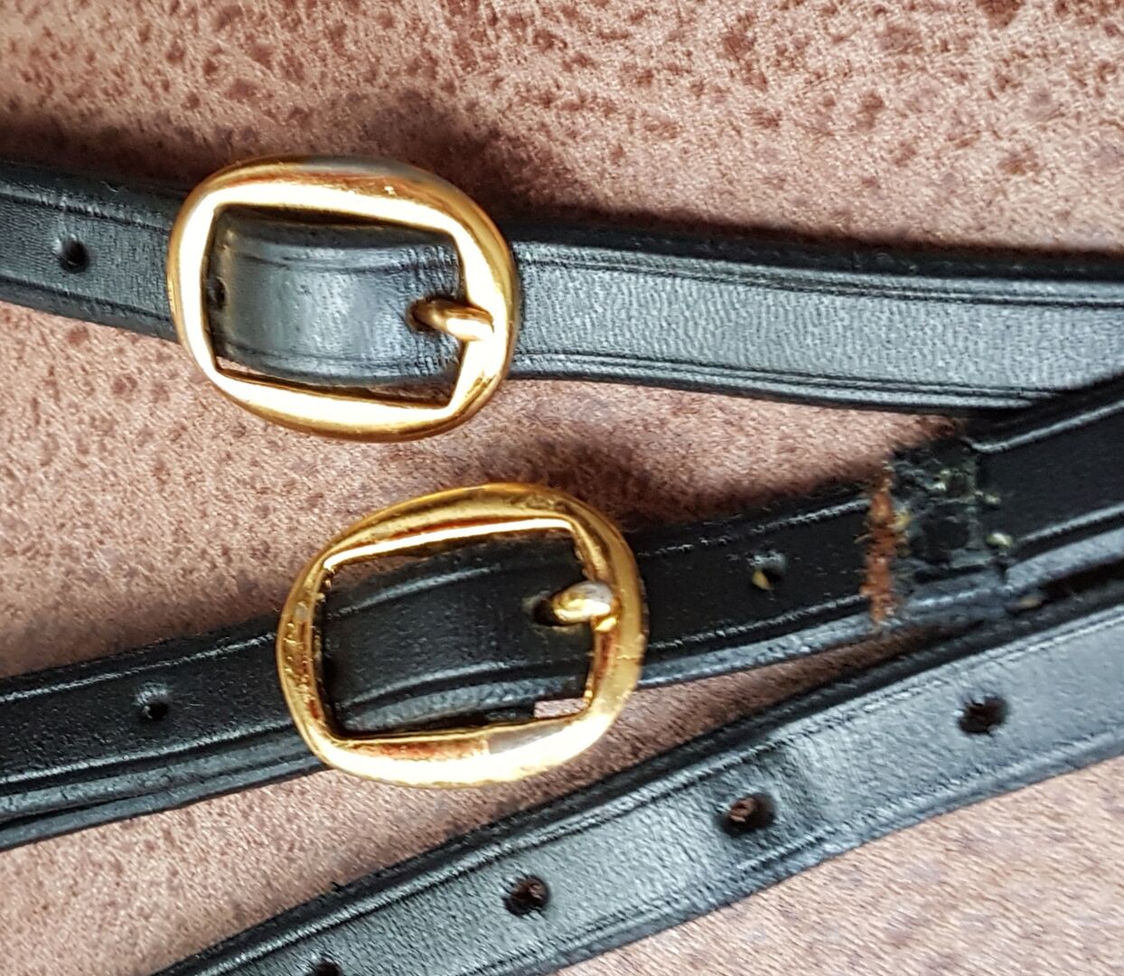 Kaakriem Mexicaans Caveson - Fancy pine snaffle met goudkleurige gespen. De frontriem is van Barnsby. Zonder teugels. Eén wangstuk is gescheurd en gestikt. Verder is de conditie erg goed.