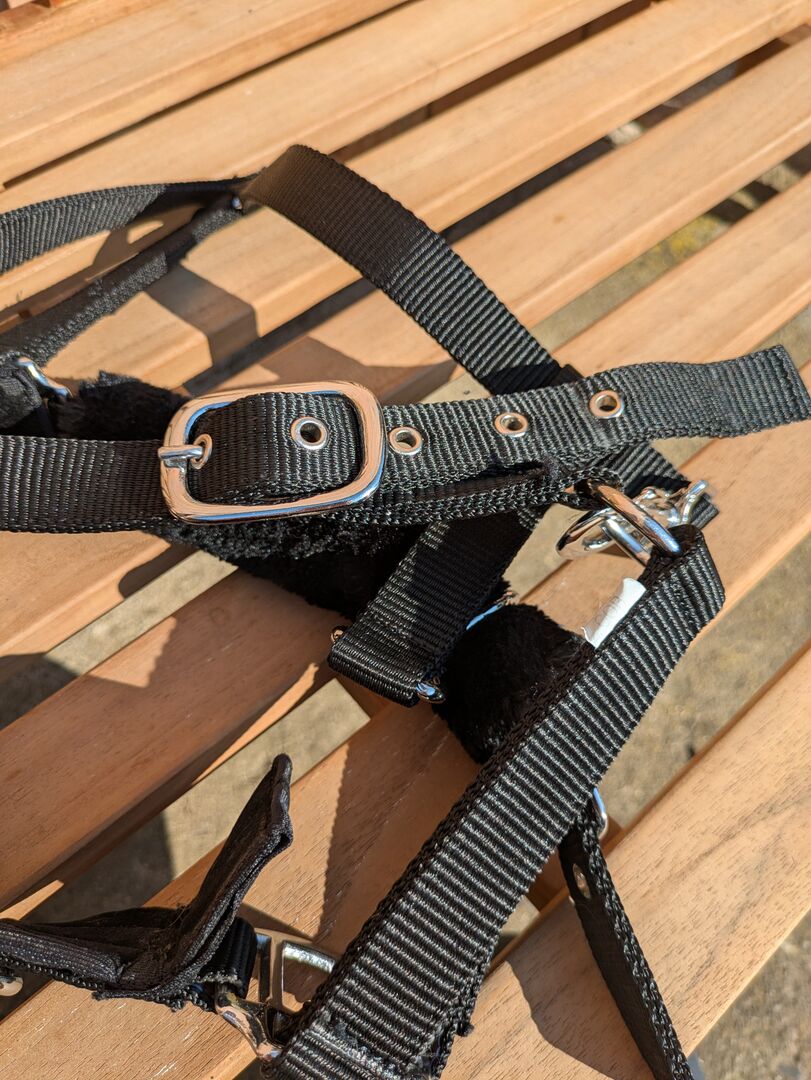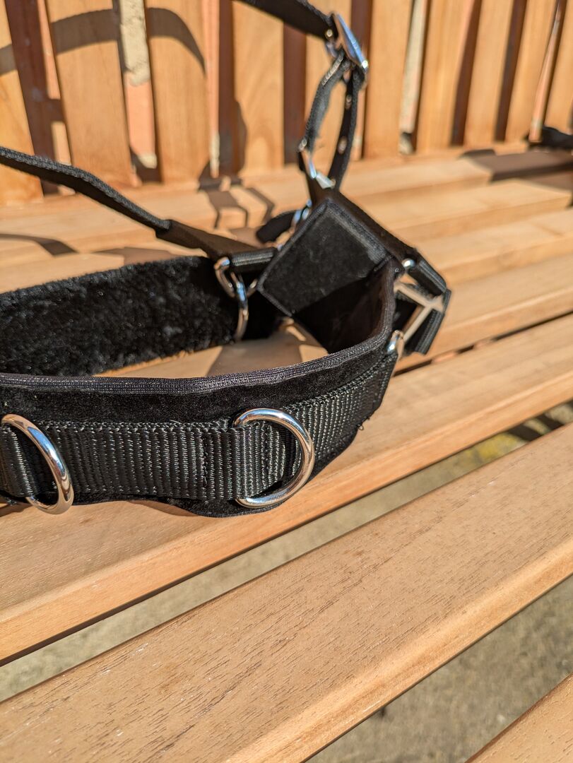 Kaptoom halster Cob - Zwart kaptoomhalster, maat Cob. Weinig gebruikt. Kinriem gevoerd met teddyvulling omdat de pasvorm voor ons niet ideaal was.