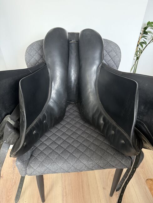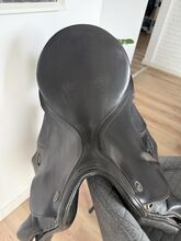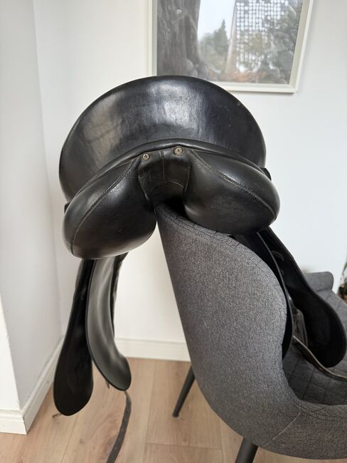 Bijzonderheden: Kleur: Zwart Maat 1: komt overeen met 17''/17.5'', halfdiepe zit, kort contactoppervlak Kamerbreedte: Medium, ca. 33. gemakkelijk aan te passen door de zadelmaker Singelbanden: 2 jaar geleden nieuw gemaakt, V-girthing Toevoeging: Wordt verkocht met zadeltas