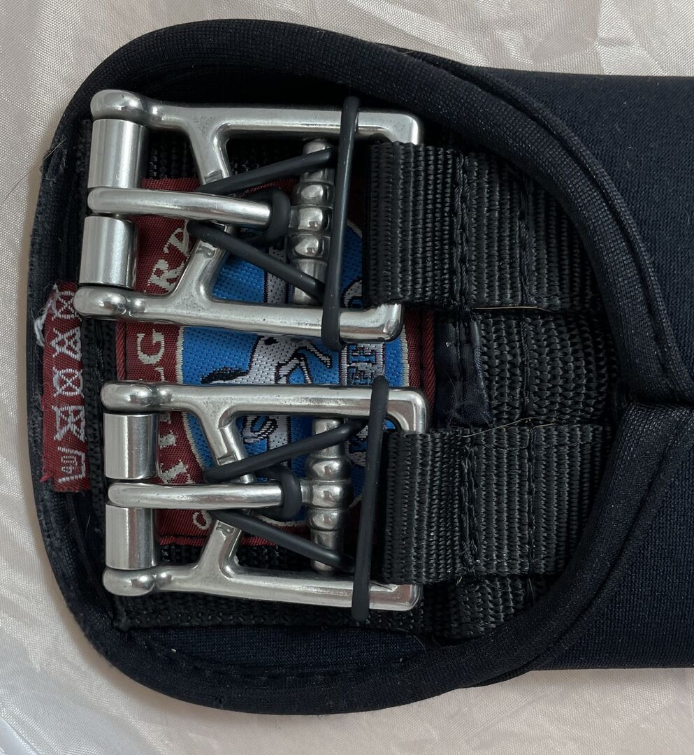 Kieffer korte singel, neopreen, zwart, lengte 75 cm - Verkoop een korte singel van Kieffer van lengte ca. 75 cm (rol tot rol). De zwarte neopreen singel heeft normale gebruikssporen (zie foto's). Alle vier de rolgespen zijn voorzien van de Kieffer elastomeerband voor een gemakkelijke re-girthing.
